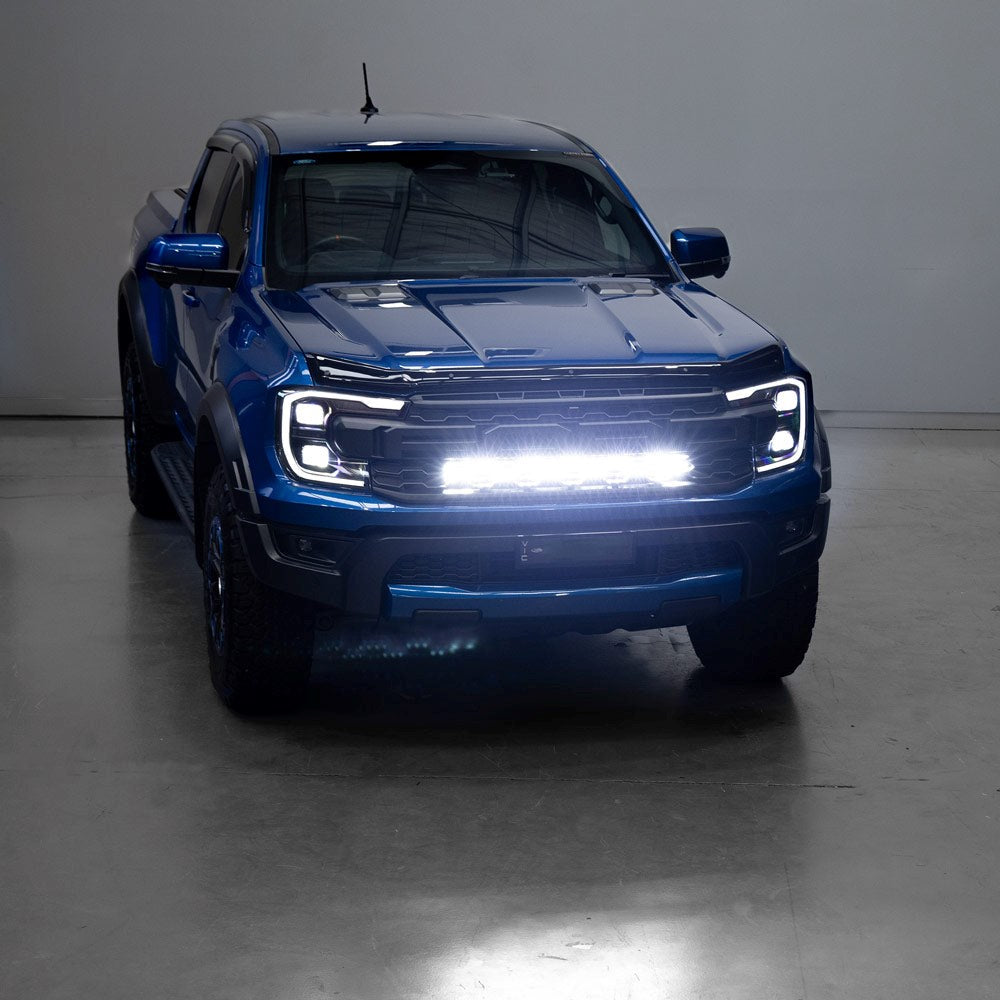 The Next Gen Raptor is equipped with the best LED headlights on a Ranger to date; however, with ADR lumen limits, there's still a lot to be desired for both lumen volume and distance, especially in higher speed, Baja conditions. Our solution? A bespoke kit to mount our renowned 32" Double Row Commander LED Light bar behind the grille, boasting a near four-fold lux increase with factory integration to the Auxiliary switches.